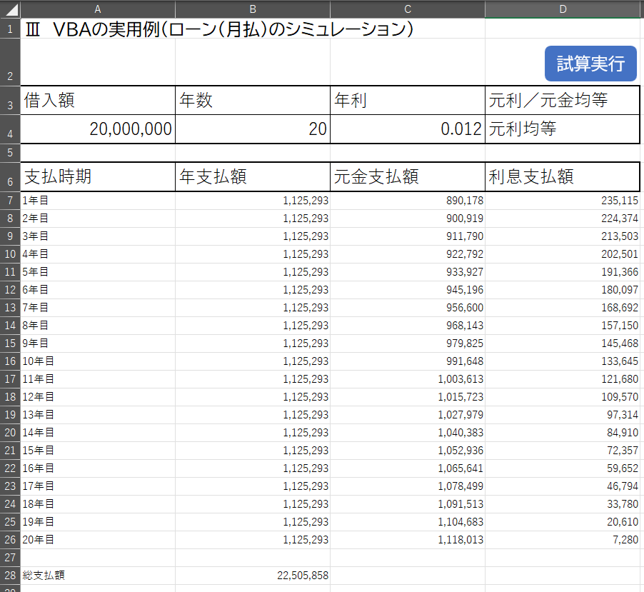 それでは、これまでの基本パターンの応用として実用的なプログラムを見てみましょう。VBAを使い出して間もないころ、ローンのシミュレーションをしたのを思い出したので、今回は、それを題材にしてみました。みなさんもやってみてください。