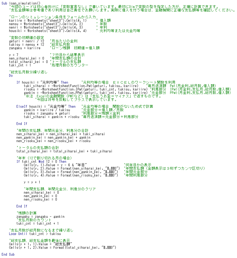 tuki_siharai = -WorksheetFunction.Pmt(geturi, tukisu, kariire)    '毎月返済額 Pmt(月金利,総月数,借入額)