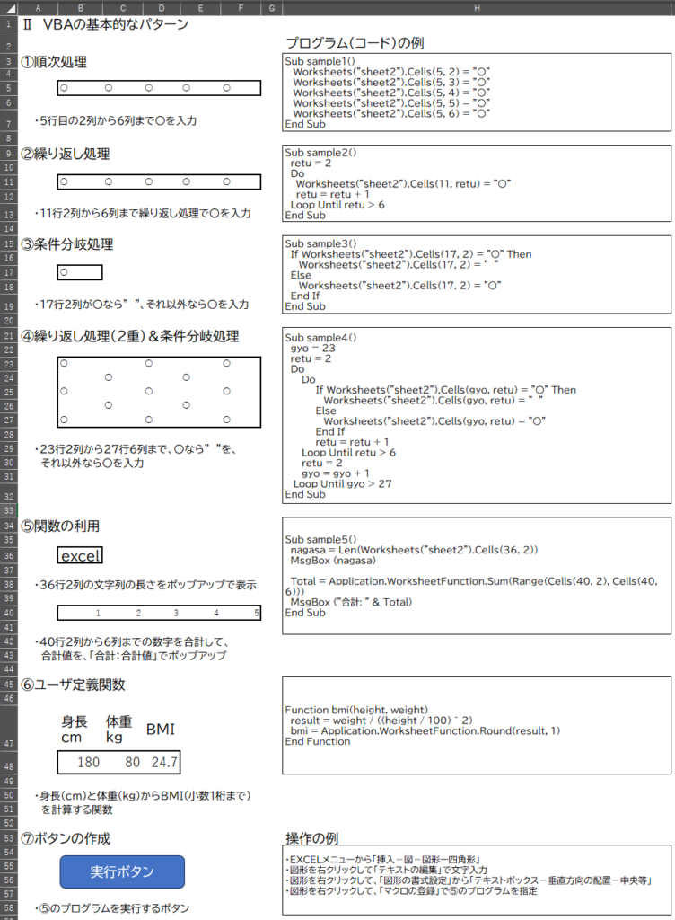 ここで示したようにEXCELのブックとVBAに入力して使っていただけますので、是非、お試しください。以下、①~⑥のコードの例ですので、コピー等してお使いください。